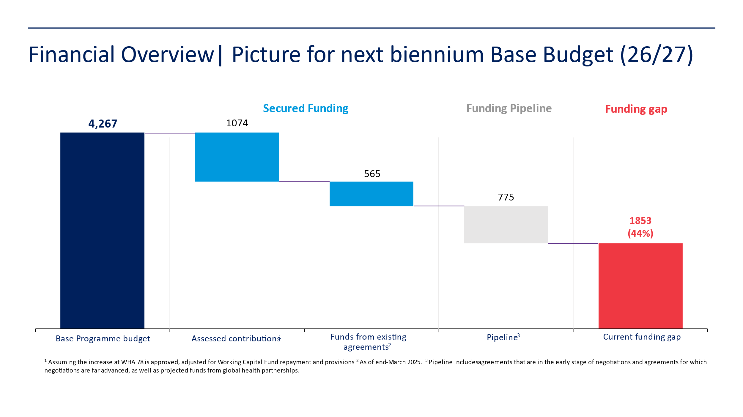 The proposed base budget for 2026-27 stands at US $ 4.2 billion. Base budget is the largest component and the scope is set by WHO, covering and work done across all three strategic priorities as well as the enabling functions – by country offices, regional office and headquarters.