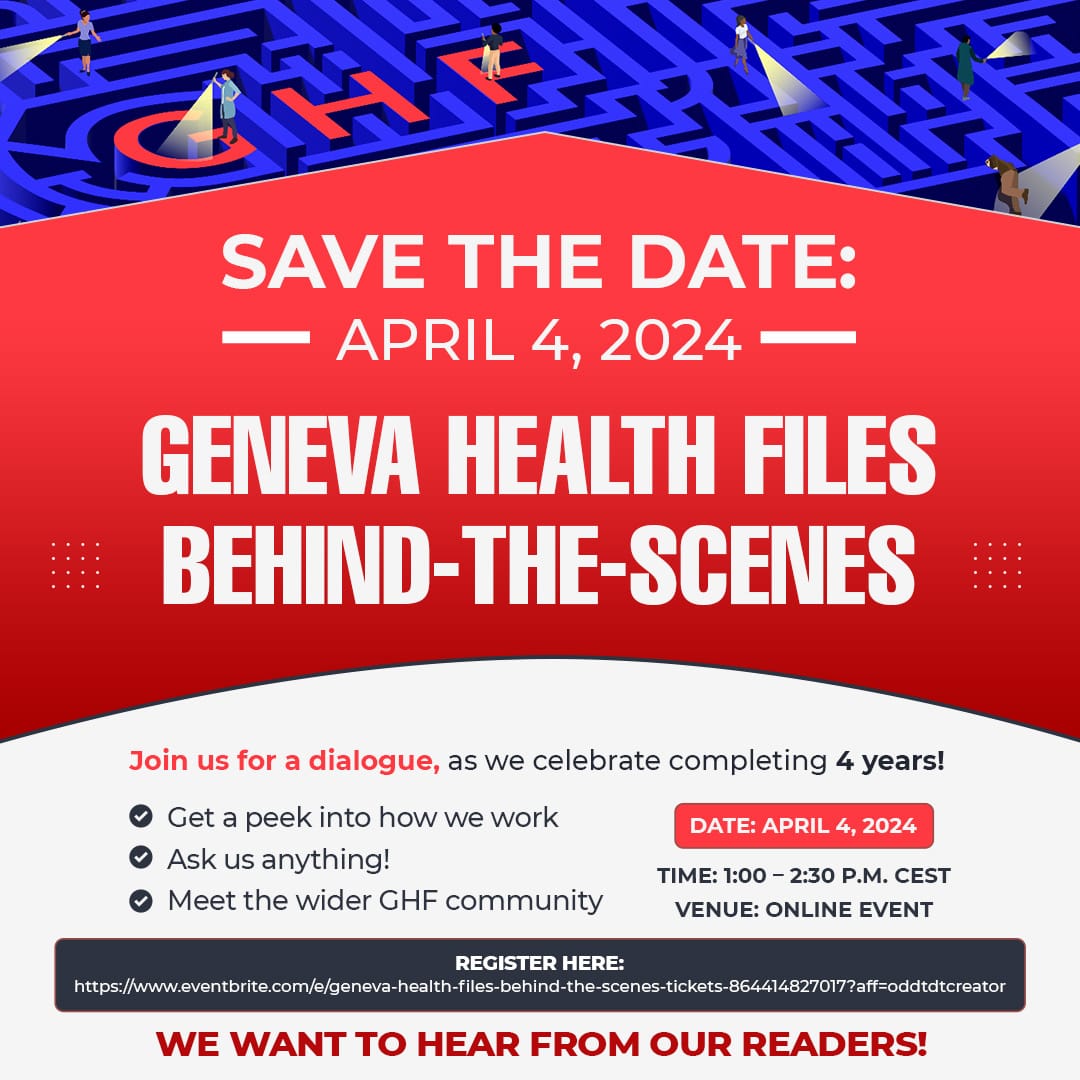 Register here: https://www.eventbrite.com/e/geneva-health-files-behind-the-scenes-tickets-864414827017?aff=oddtdtcreator