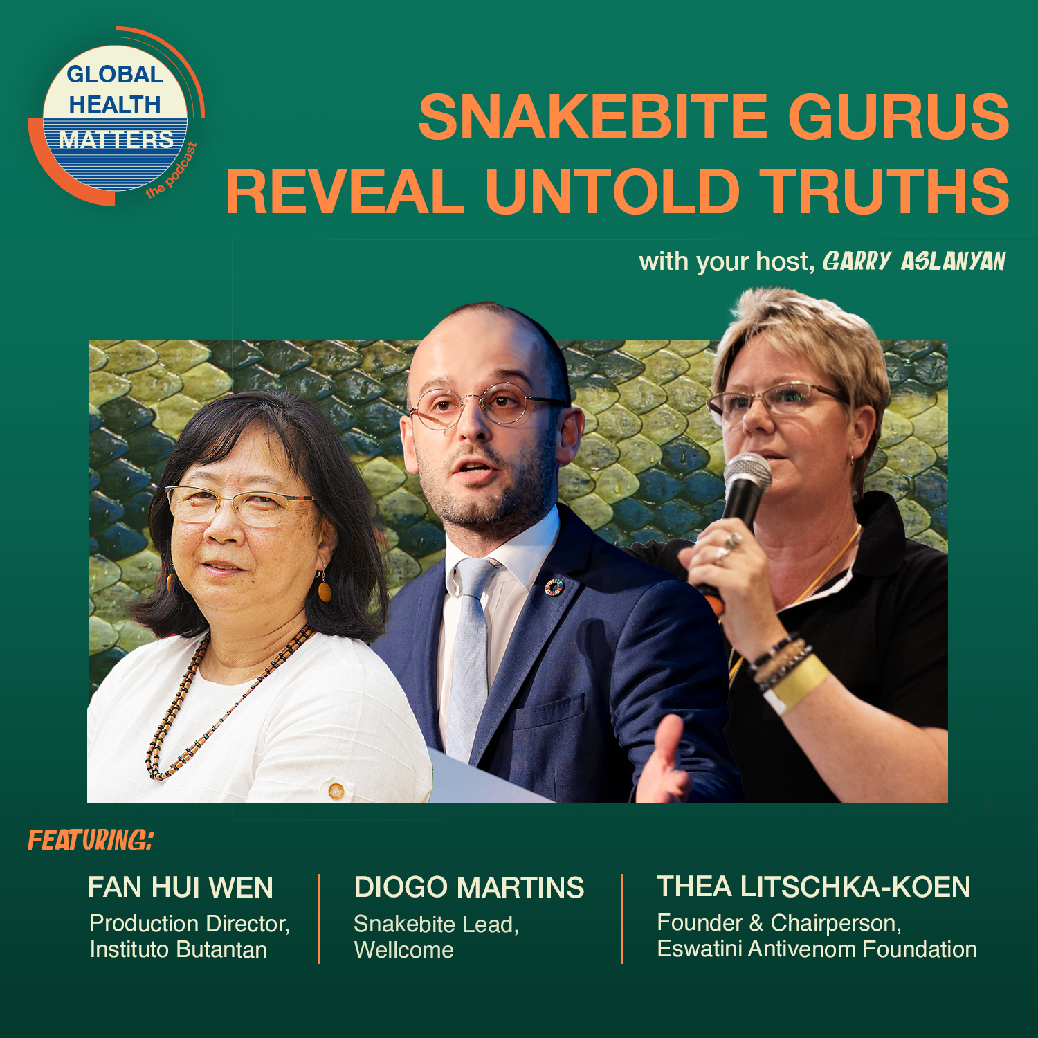 Host Garry Aslanyan speaks with Fan Hui Wen and Thea Litschka-Koen, snakebite gurus in Brazil and Eswatini, respectively, who reveal untold truths about snake bites in their communities and the complexities associated with producing and administering antivenom. Diogo Martins, the research lead for snakebite at Wellcome in the United Kingdom, makes the case for why we should consider snakebite a global health issue.