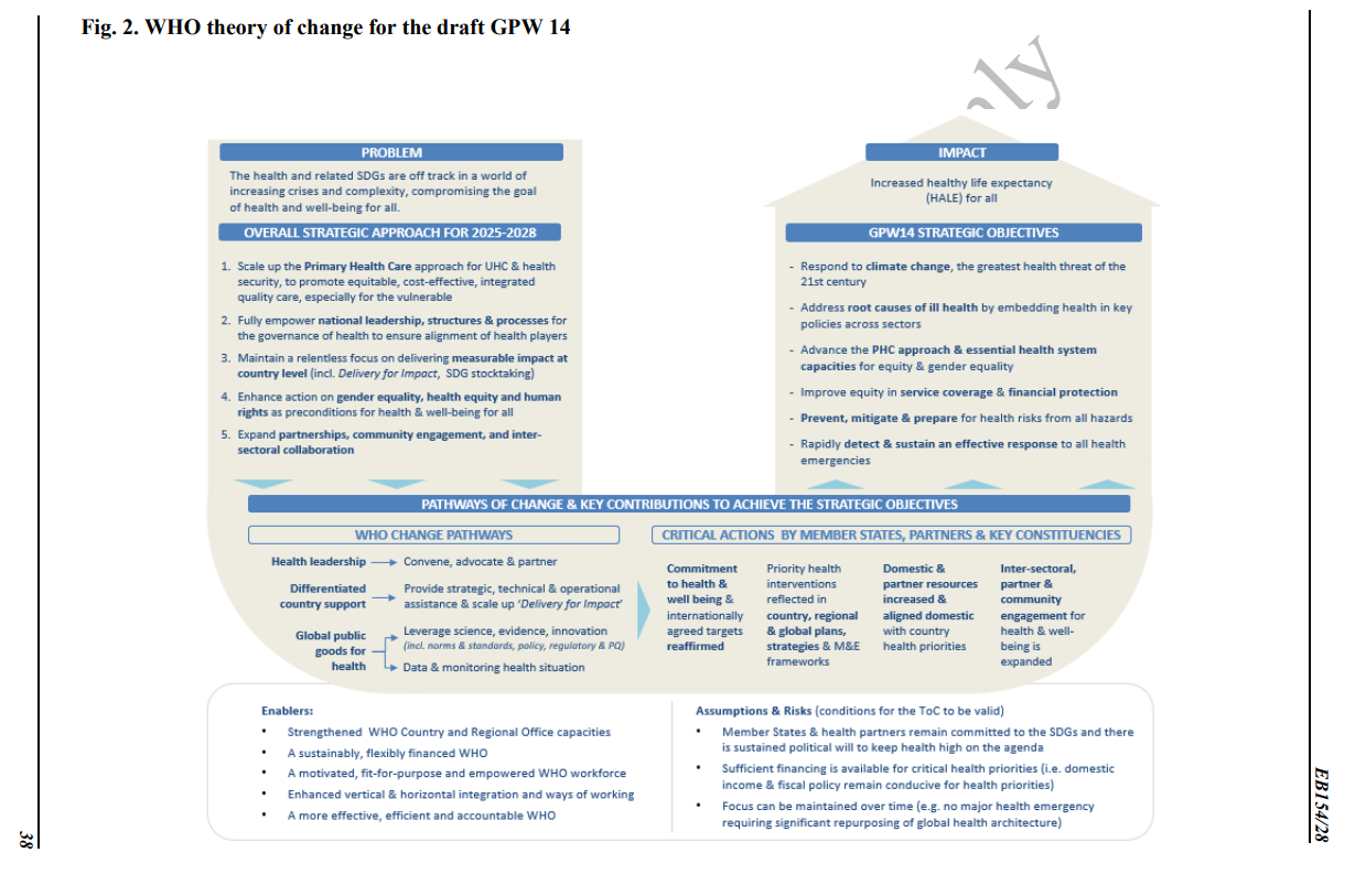 While the main investment round is planned later in the year, WHO member states will first discuss the GPW14 at the Executive Board meeting this month. The results framework (outcome and outputs) is also expected to be finalized. This will inform a high-level budgeting process by the secretariat to provide “more refined indicative envelopes by outcomes”, that will be consider by the Seventy-seventh World Health Assembly in May 2024.