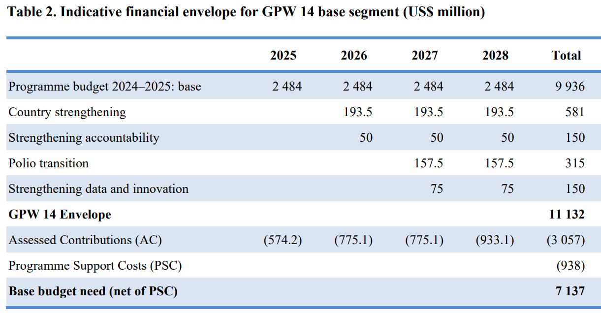 The timing of the investment round has been made to coincide with the new General Programme of Work or GPW14 that sets the strategy of the organization. The goal is to fully finance the base segment of the budget. According to WHO, the “indicative” GPW is currently estimated to cost US$11.1 billion during 2025-2028. The GPW is currently under development. The amount WHO seeks to raise, US$7.1 billion is outside of US$ 3 billion in assessed contributions and US$938 million in program support costs.